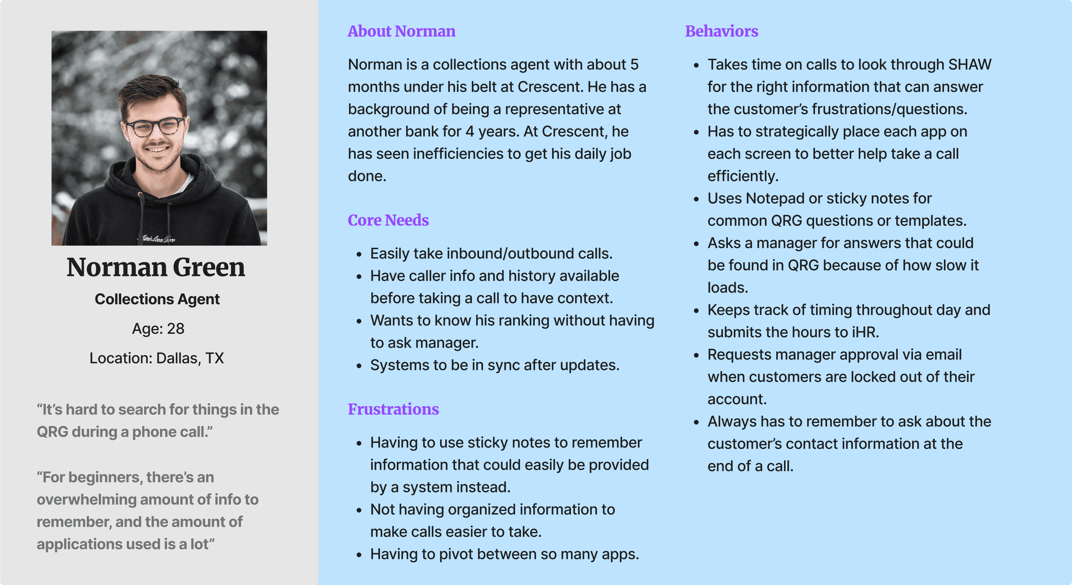 "Norman needs a way to easily access relevant data because he wants to efficiently use his time with each customer and improve his performance."