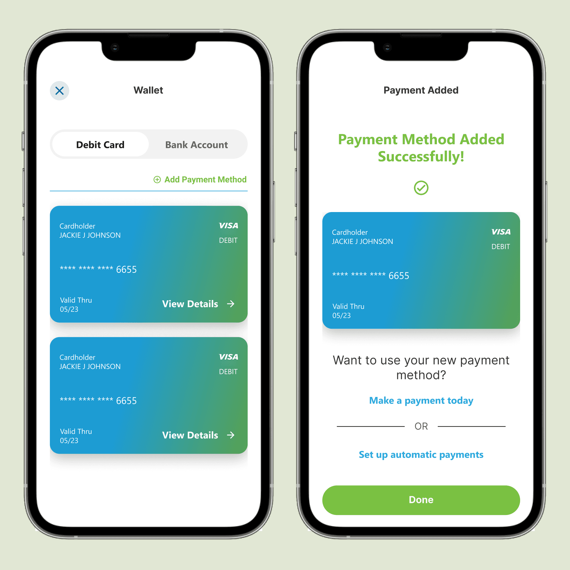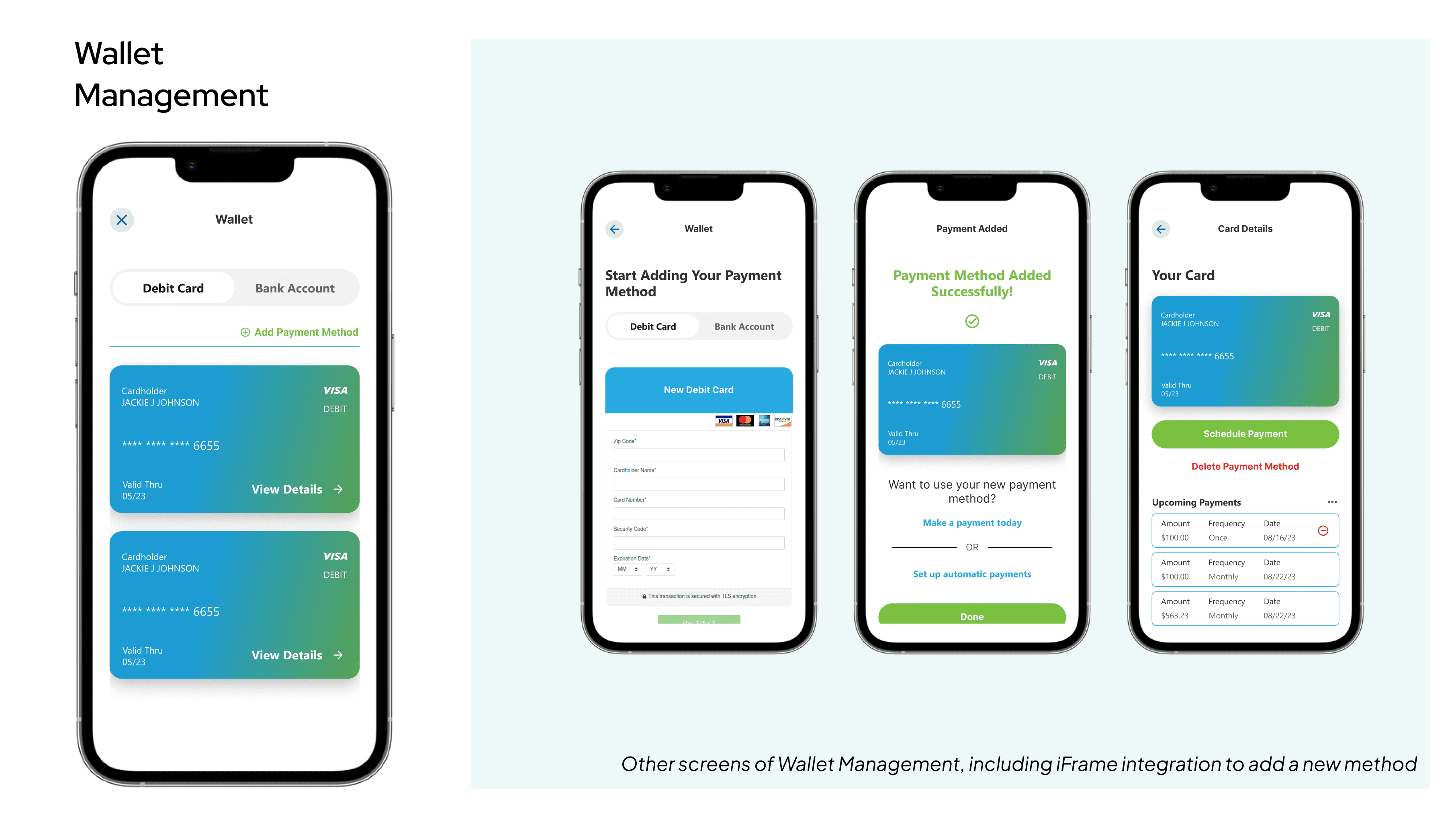 The most complex widget allowed customers to save, view, and manage payment methods. I designed visual card representations, detail views, and flows for adding or deleting payment methods — making it easy to see what was saved and take action quickly.