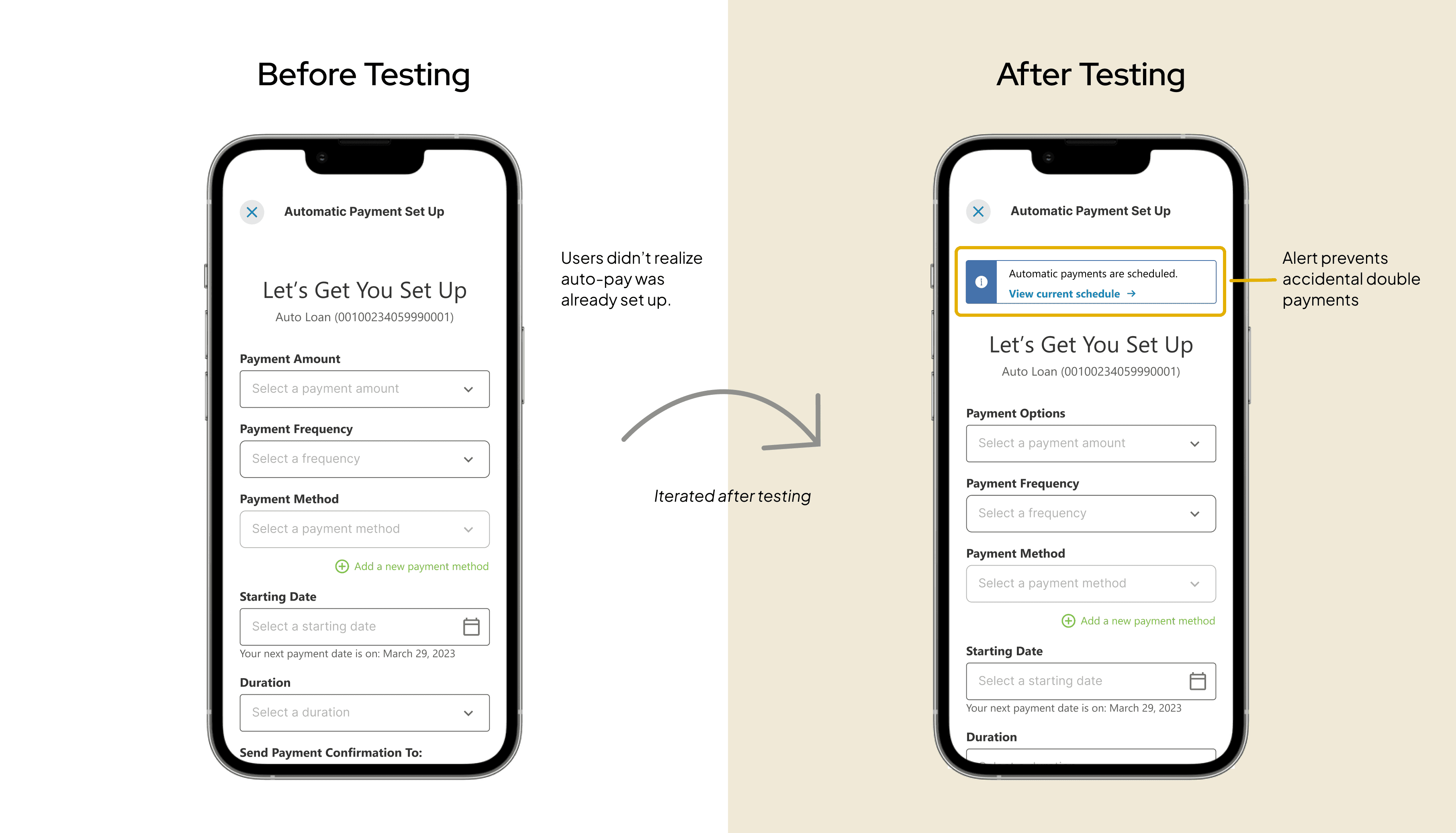 During testing, we discovered users didn't realize they already had auto-payments scheduled. This taught me to design for edge cases (like existing data) from the start, not just happy paths.